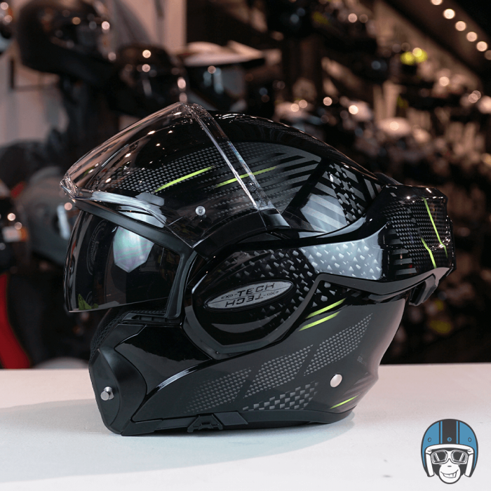 Dubbel gehomologeerde flip-up helm van Scorpion. Dit zorgt voor een betere aerodynamica en een betere gewichtsverdeling van de helm. As you can see a very competitive sector where the Scorpion Exo Exo-Tech goes in strong thanks to its PJ homologation making it a good option for those looking for a day to day helmet for town and road.